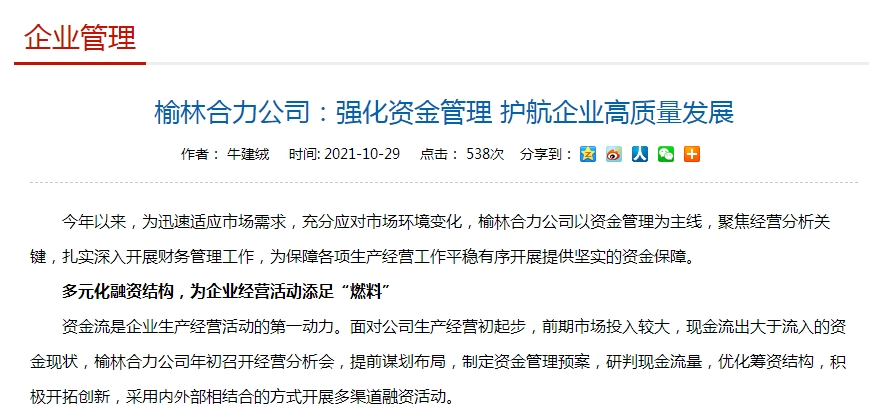 陜煤集團(tuán)網(wǎng)站——榆林合力公司:強(qiáng)化資金管理 護(hù)航企業(yè)高質(zhì)量發(fā)展